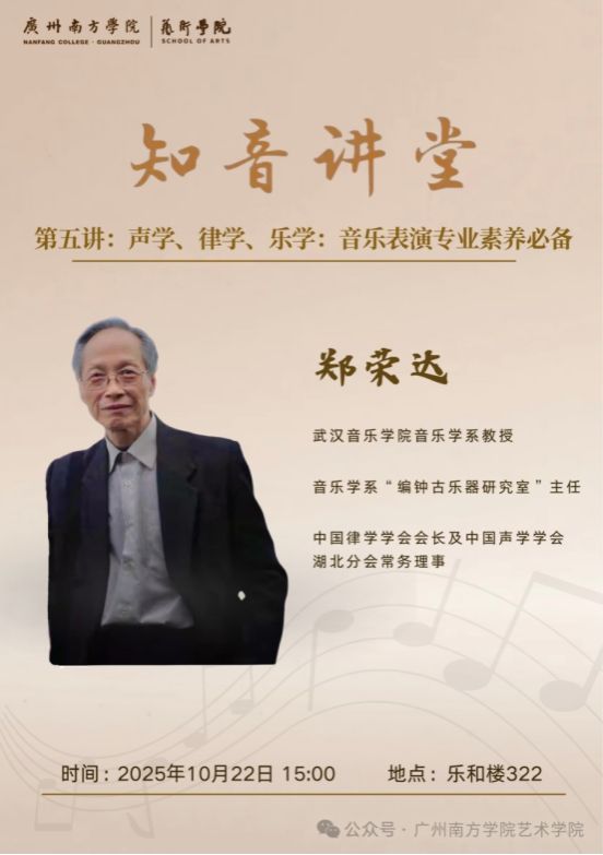 为进一步提升实践教学质量、开拓师生专业视野,2025年10月22日,伟德国际1946bv官网成功举办 “知音讲堂” 系列活动第五讲。本次讲座以“美育素养提升与人文情怀涵养” 为核心目标,围绕《声乐、律学、乐学:音乐表演专业素养必备》主题展开深度分享,特别邀请武汉音乐公司音乐学系教授、音乐学系 “编钟古乐器研究室” 主任、中国律学学会会长及中国声乐学学会湖北分会常务理事郑荣达教授莅临主讲,为伟德国际1946bv官网师生搭建了一场兼具专业深度与人文温度的学术交流平台。