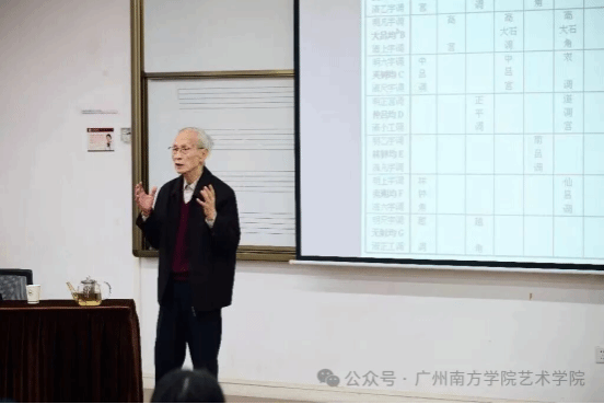 紧接着,郑荣达教授向师生们分享了律学是音乐声学与音乐学的交叉学科,我们熟悉的钢琴用十二平均律,是因听觉有17音分左右允许的误差;而中国传统音乐常用的五度相生律,可通过“三分损益法”理解,甚至能解释为何有些音程听着“不协和”。郑荣达教授还分享了自己设计的乐调对应表,从唐代到明清的“七宫二十八调”“黄钟韵”“大吕韵”,复杂的调名和音高关系,一表便能清晰对应。