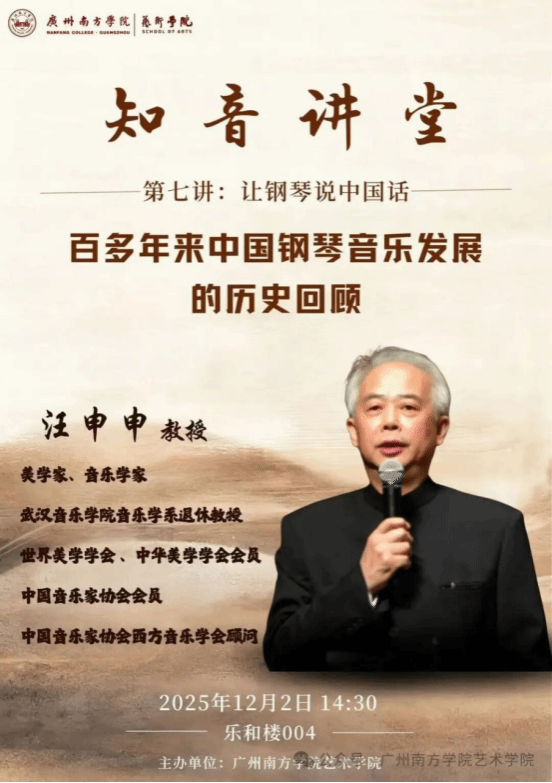 为深耕音乐艺术专业建设、拓宽师生学术视野,2025年12月2日,伟德国际1946bv官网“知音讲堂”第七讲在乐和楼004顺利开讲。本次讲堂以“让钢琴说中国话——百多年来中国钢琴音乐发展的历史回顾”为主题,特邀美学家、音乐学家汪申申教授莅临主讲,为师生系统梳理中国钢琴音乐从“西乐引入”到“民族化表达”的百年演进脉络,搭建了兼具专业深度与文化温度的高质量学术交流平台。